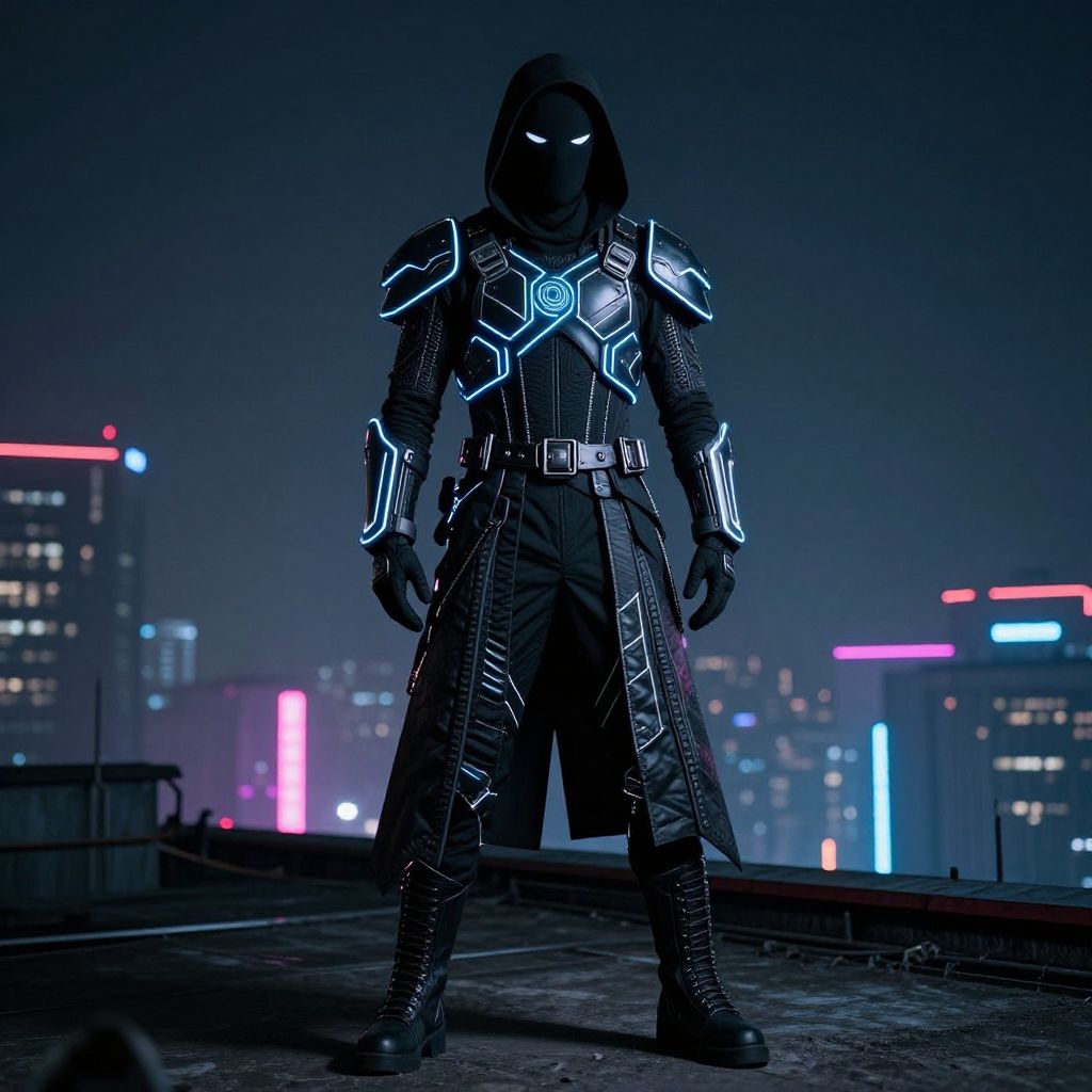 Mayhem guy costume worn by a mysterious figure standing on a rooftop at night, neon city lights in the background, dark foggy atmosphere, intricate costume details highlighted by glowing lines, futuristic dystopian vibe, highly detailed artwork