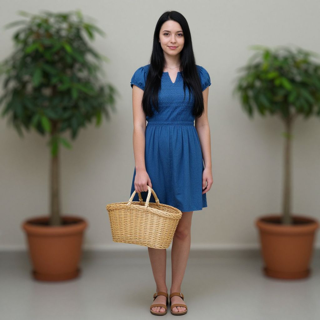 Basket outfit, 1girl, solo, dress, black hair, blue dress, basket, holding, sandals, standing, long hair, full body, looking at viewer, potted plant, realistic, fine art parody, blurry, short sleeves, holding basket
