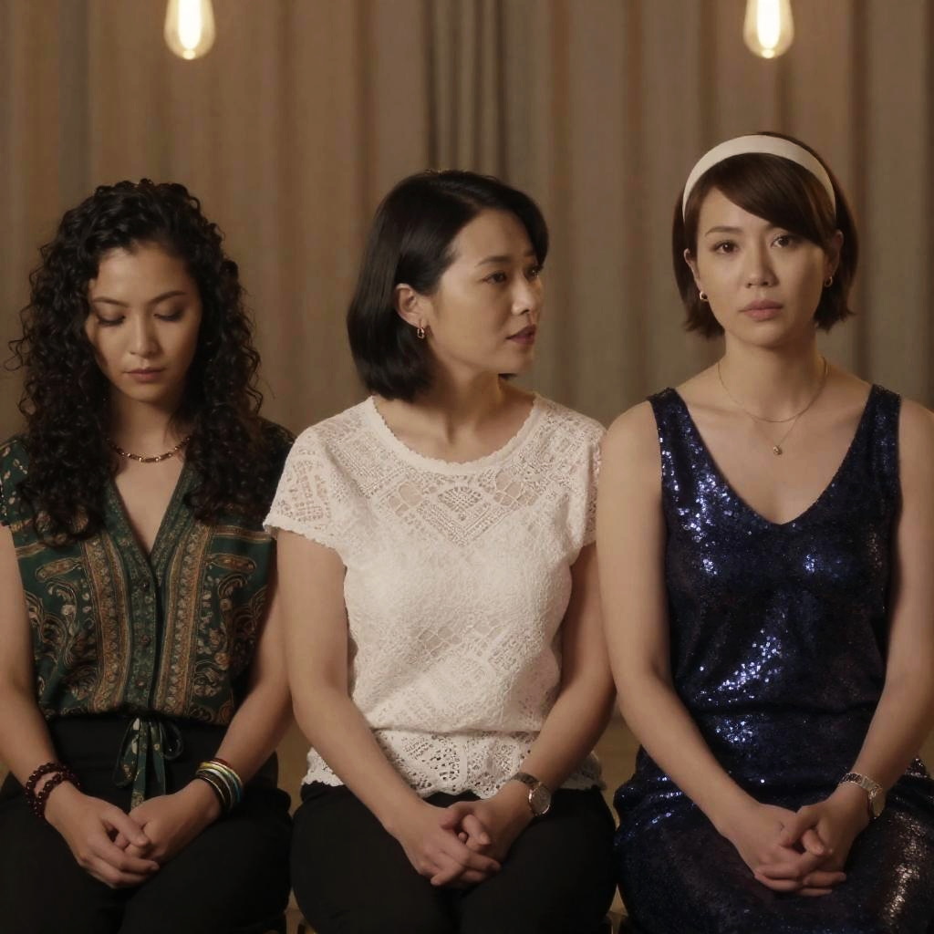 Photograph of three women sitting closely together. The woman on the left has dark curly hair, green patterned top, and multiple bracelets, looking downward. The middle woman has short dark hair, white lace top, and neutral expression, looking at the woman on the right. The woman on the right has short brown hair, dark blue sequin dress, white headband, and necklace, looking at the camera. Background features soft brown curtains and hanging lights. All women hold objects in their hands.