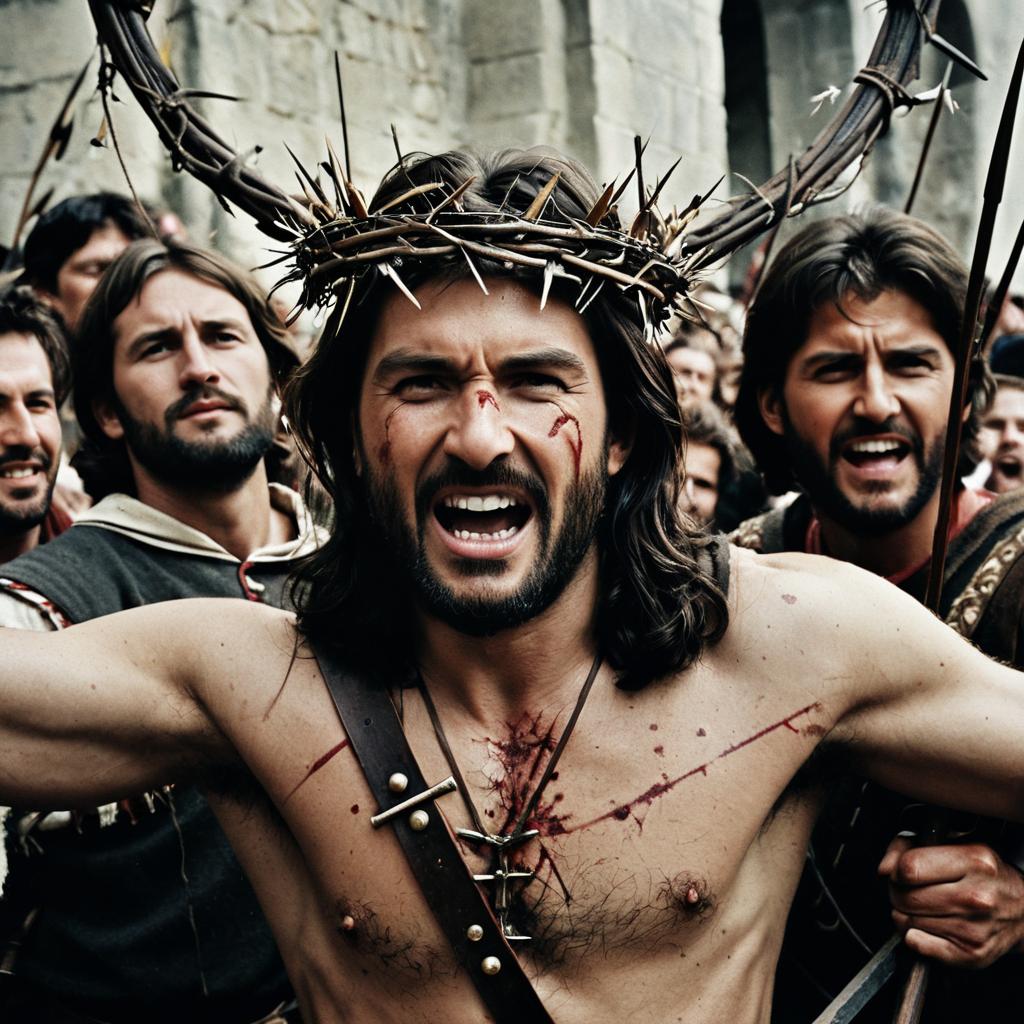 Saint Sebastian, spirited and defiant, archers and spectators, Blooming The Passion of the Christ, crown of thorns, suffering looking face, strong sense of realism, mocking and laugh at jesus christ, in the style of still lifes