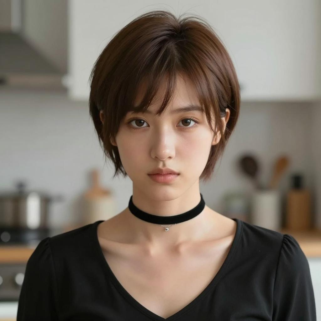 Blue pixie cut hairstyle, photorealistic portrait of a young woman with short, vibrant blue hair, green eyes, fair skin, wearing black sleeveless top, silver earrings, delicate necklace, subtle makeup, blurred background, soft lighting, realistic ures, high detail, front-facing, focused expression, modern style
