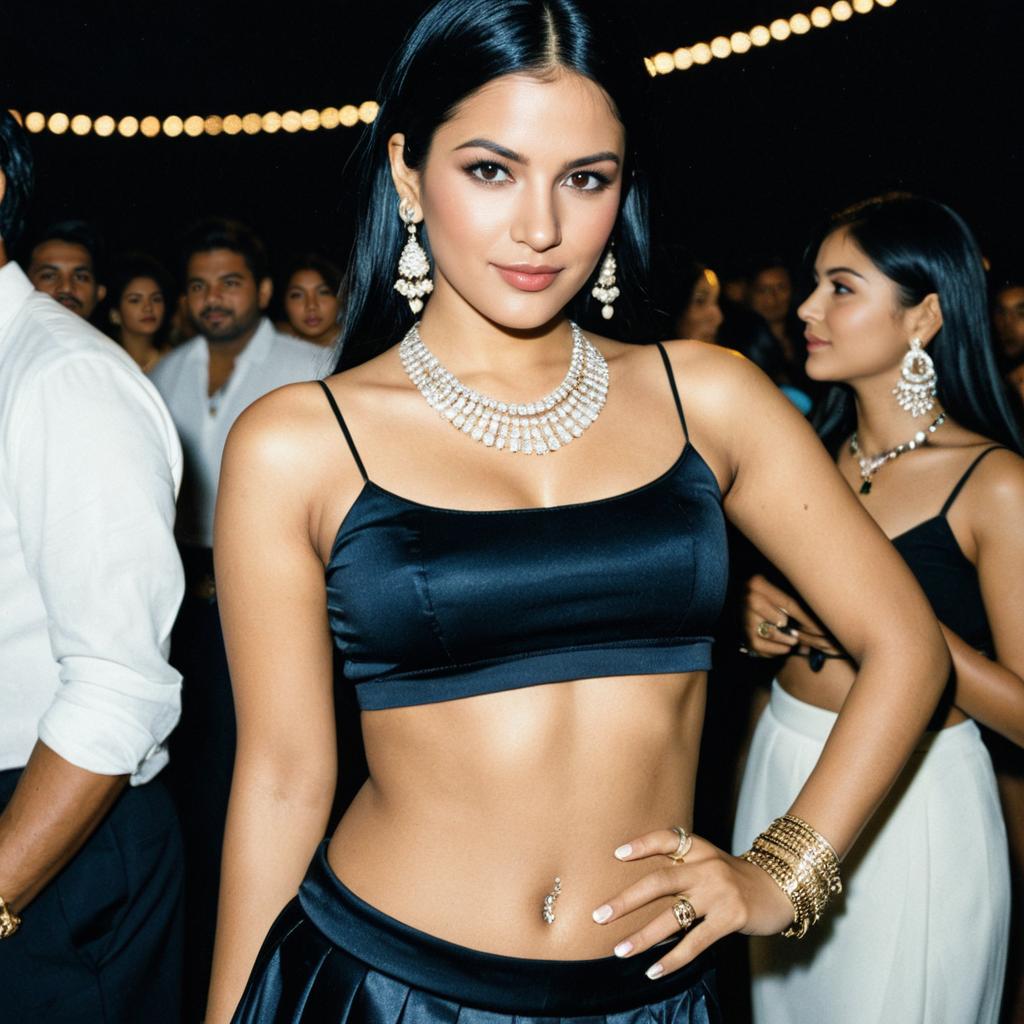 A portrait of a woman wearing a black crop top lehenga with a shrug. She has medium skin tone with long black hair, adorned with pearl jewelry including earrings, necklace, and a detailed waistband. The outfit highlights her midriff and cleavage. The background is indoors with a blurred dark dresser and lamp.