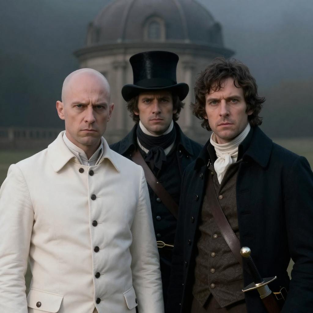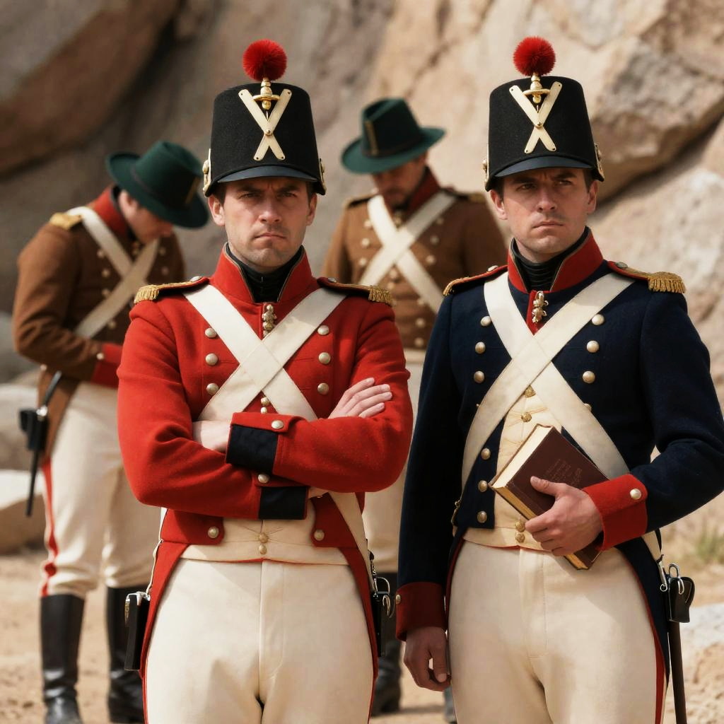 Photograph of two men in Napoleonic-style military uniforms with black hats and red and navy jackets, standing in rocky terrain. The man in front has crossed arms, stern expression, and prominent red pom-pom on his hat. The second man holds a book, looking to the right. Two other men in brown clothing and green hats are in the background, one bent over. Sunlight illuminates the scene.