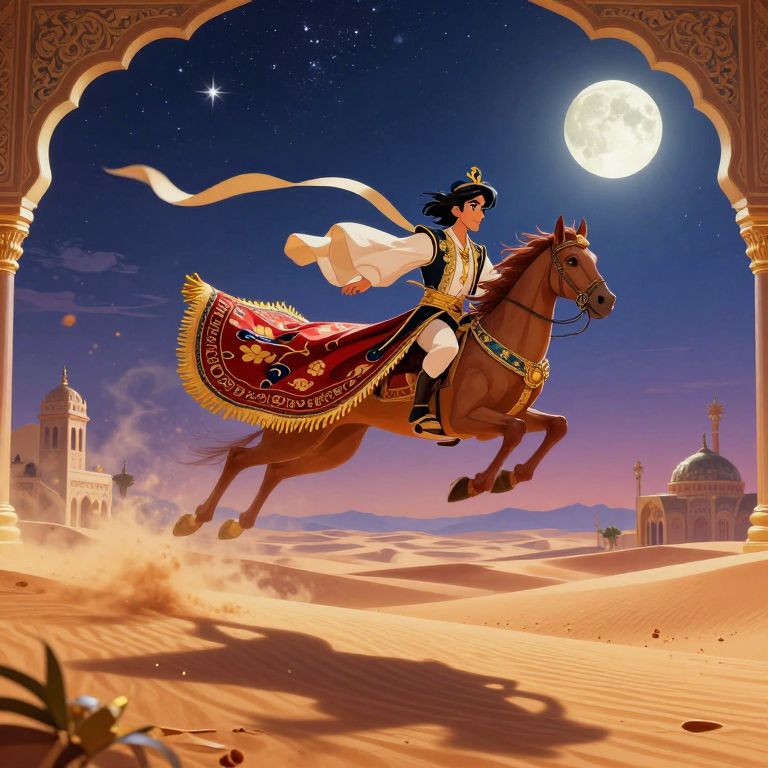 Aladdin's flying carpet soaring over a mystical desert landscape, golden sands and distant mountains, a starry night sky with a full moon, ornate Middle Eastern architectural elements, dynamic and colorful fantasy art.