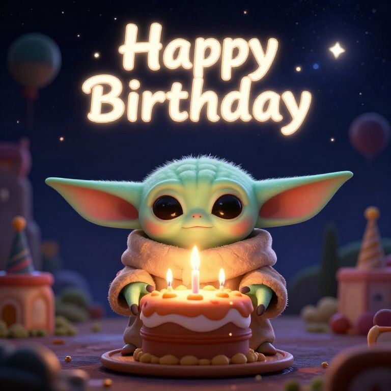Birthday wishes baby Yoda happy birthday, Baby Yoda holding a birthday cake with glowing candles, magical lights around, detailed space-themed party setting, enchanting and heartwarming scene