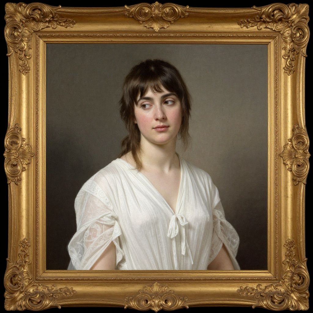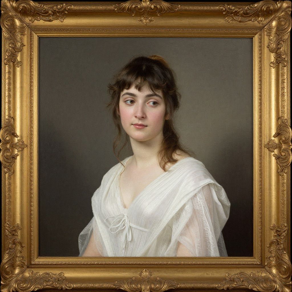 Framed within an ornate gold border, a portrait by Belgian artist Firmin Baes (1874-1943) depicts a serene young woman in a classical white gown, her gaze directed thoughtfully to the side against a muted gray background.