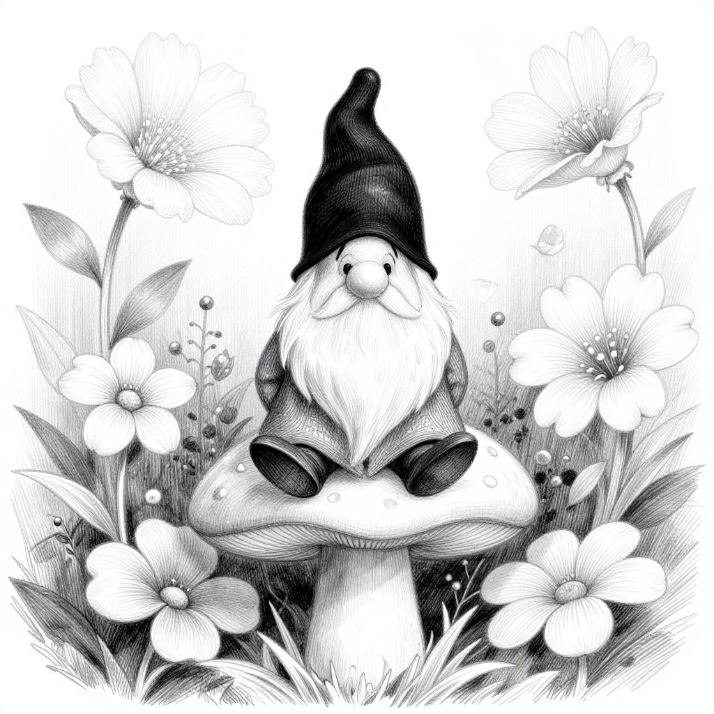 A black and white gnome sitting on a mushroom in an enchanted garden, delicate cross-hatching, expressive eyes, surrounded by oversized flowers and plants, magical realism, hand-drawn sketch style with elegant contrast and depth.