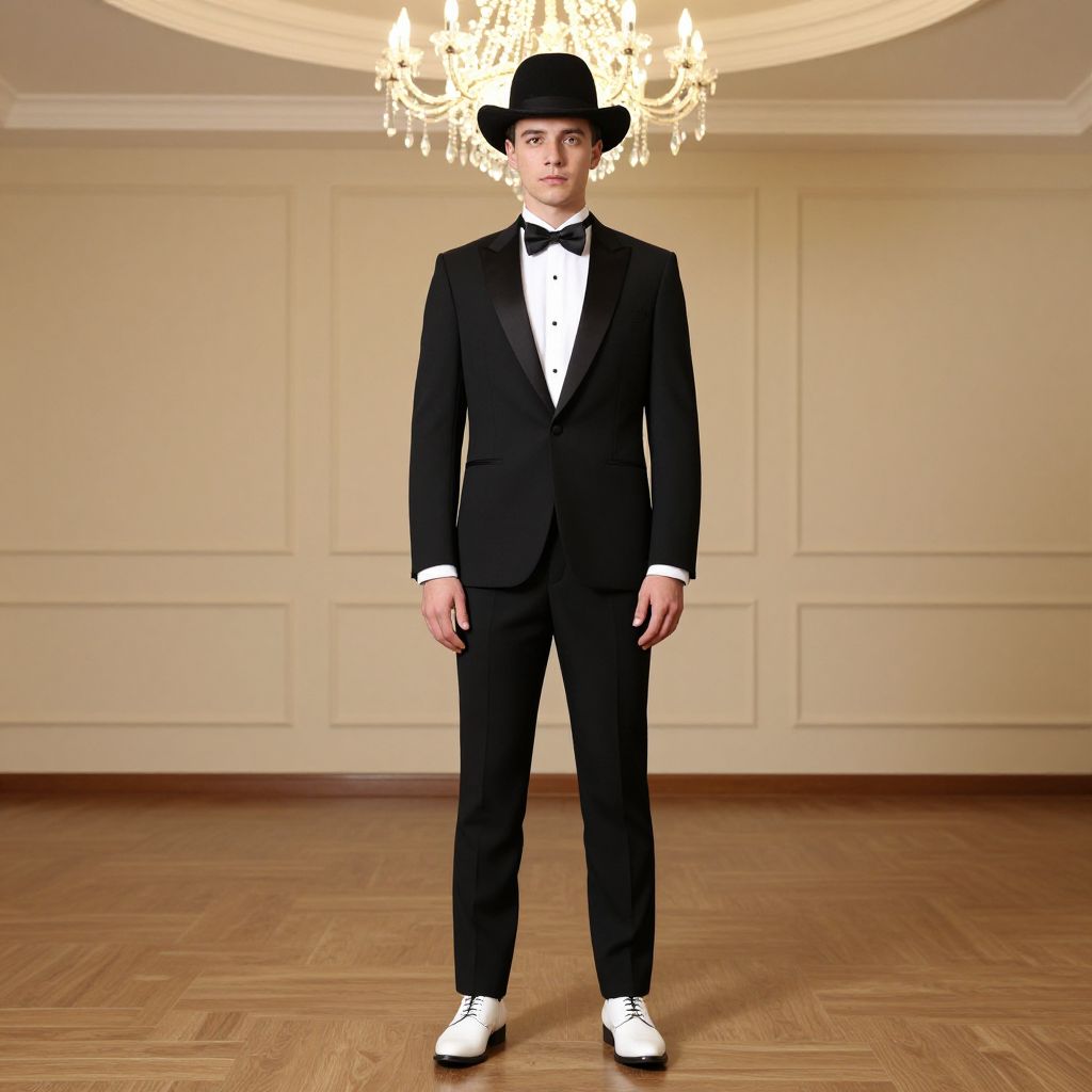 Fancy costume party, male focus, 1boy, bowtie, hat, bow, chandelier, pants, formal, jacket, solo, suit, tuxedo, standing, full body, shoes, white footwear
