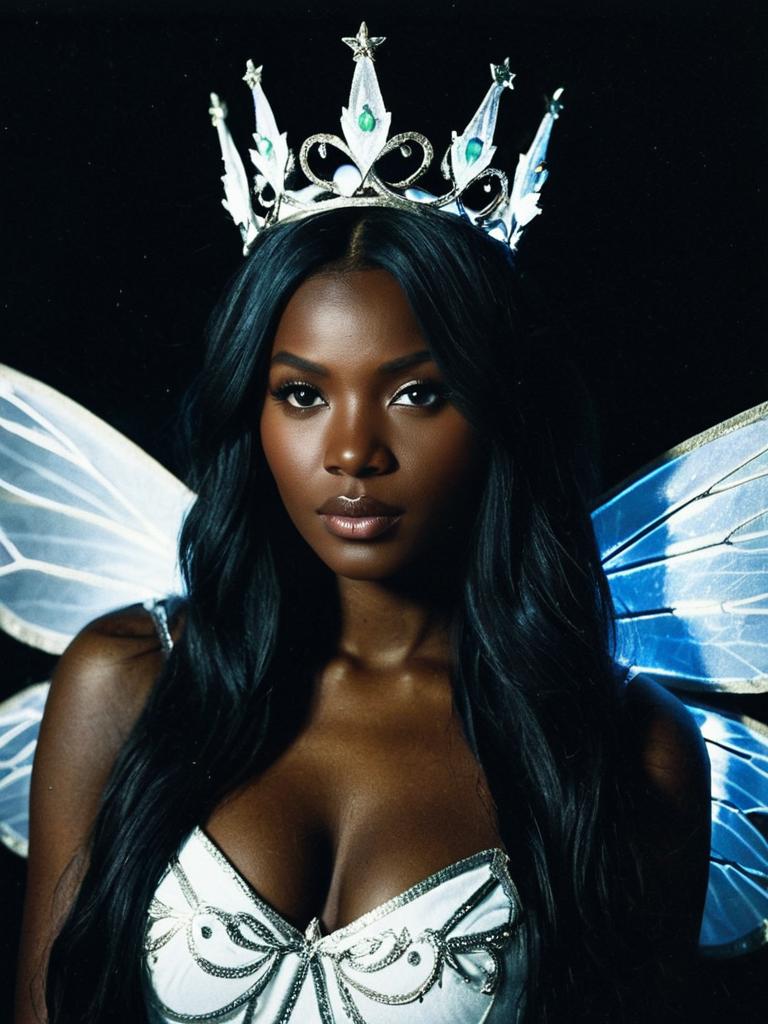 Glowing fairy costume, 1girl, solo, wings, long hair, crown, black hair, upper body, fairy, dark skin, lips