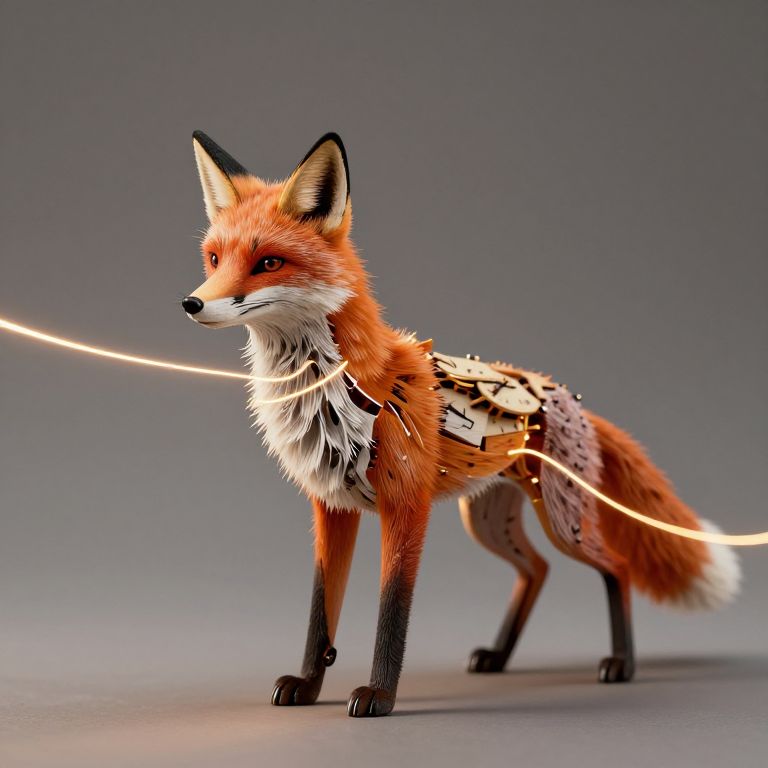 A clockwork fox weaves paths in air with physical time; every step leaves glowing threads of suspended moments to be unraveled later.