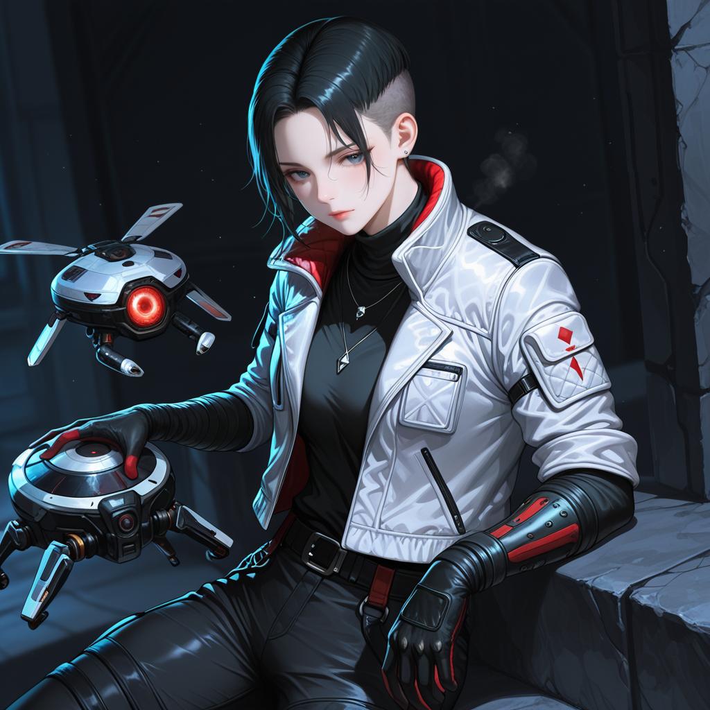 Digital illustration of a futuristic young male character with short black undercut hair and black eyes, wearing a reflective white jacket with red and black accents, black gloves, black pants, and a black turtleneck shirt. The character is seated in a dimly lit industrial environment, interacting with hovering tech drones. The style is cyberpunk with high detail and a dark background.