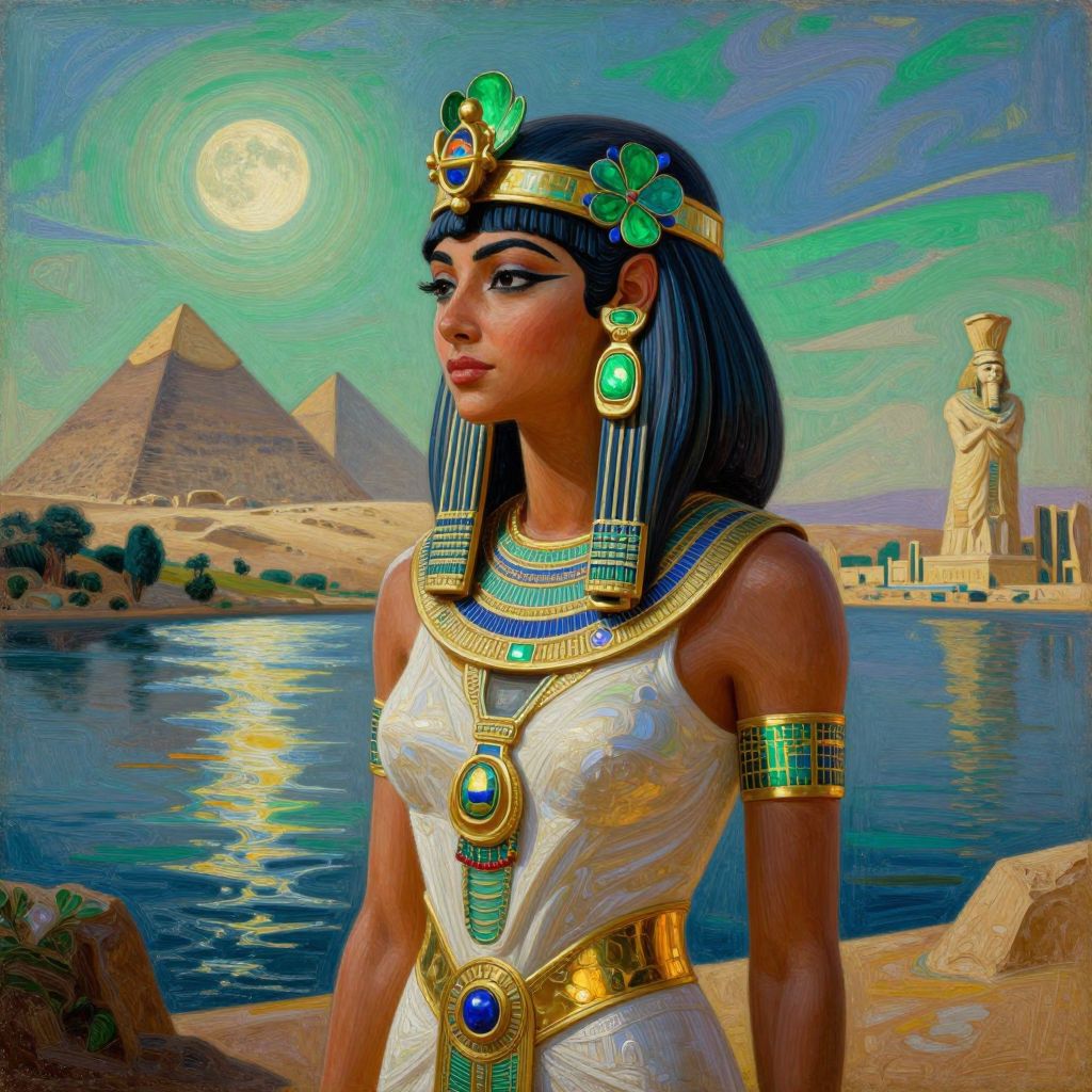 The image depicts a strikingly detailed and vibrant painting of a woman in an ancient Egyptian setting. She is adorned with elaborate jewelry, including a large, gold earring and a headpiece decorated with green and blue flowers, exuding a sense of royalty and mystique. The woman's pose is elegant and poised, with her body slightly turned to the side, creating a sense of depth and dimension. The background features a serene Nile River, with distant pyramids and a statue of a pharaoh, adding to the historical and cultural context. The sky is painted with hues of blue and green, suggesting either a sunset or a full moon, casting a soft, ethereal glow over the scene. The overall composition is rich with textures, from the smooth, reflective surfaces of the jewelry to the intricate details of the woman's attire and the surrounding landscape. The use of color is striking, with shades of green, blue, and gold dominating the palette, creating a harmonious and visually captivating image. The painting is executed with a high level of detail, reminiscent of classic oil paintings, and is enhanced with post-processing effects that add a modern, digital touch, such as holographic and iridescent elements. The scene is bathed in moody lighting, with glowing shadows and reflections that add depth and realism to the composition. The interplay of light and shadow, along with the use of color and texture, creates a sense of depth and dimension, making the image appear almost three-dimensional. The overall effect is a beautiful, cinematic representation of an ancient Egyptian scene, blending historical accuracy with modern artistic techniques.