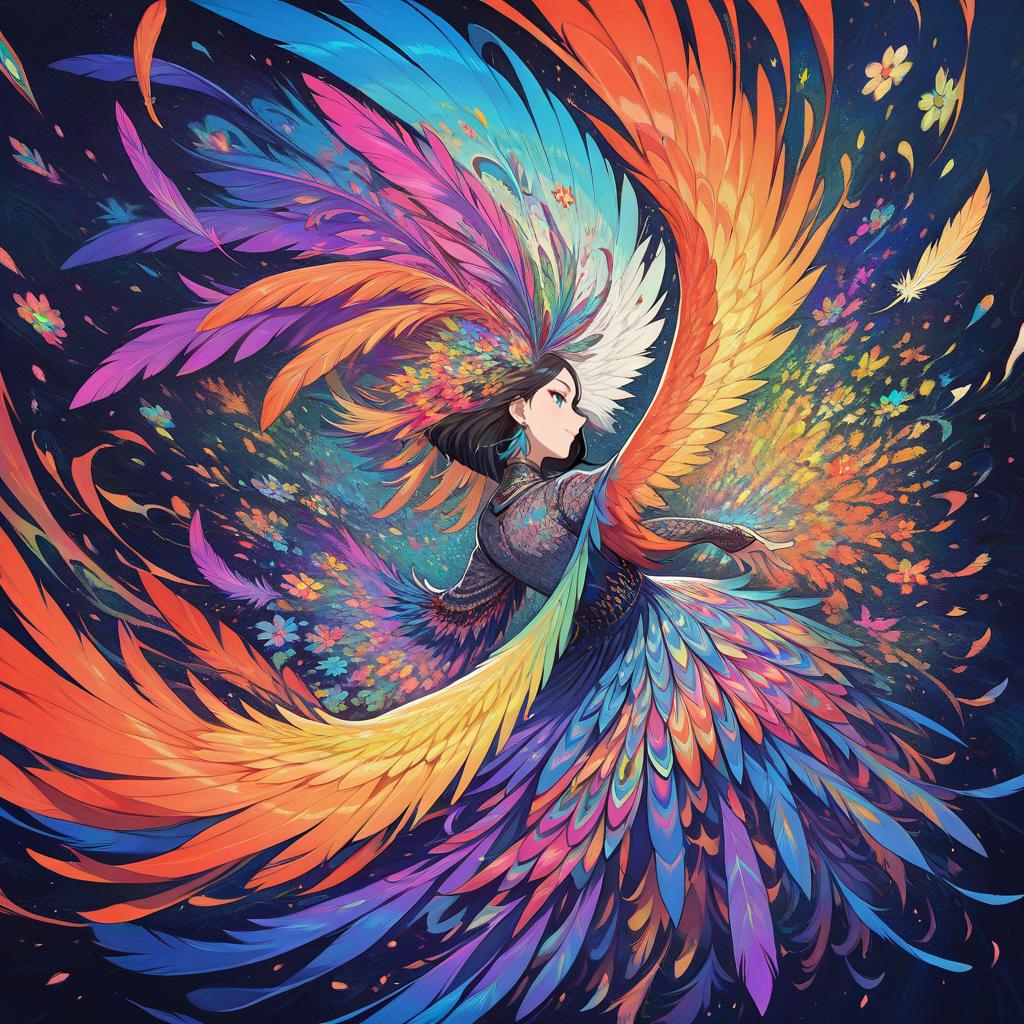 (masterpiece, top quality, best quality, official art, beautiful and aesthetic:1.2), (1girl:1.3), extremely detailed, (fractal art:1.1), (colorful:1.1)(flowers:1.3), highest detailed, (zentangle:1.2), (dynamic pose), (abstract background:1.3), (many colors:1.4), (earrings), (feathers:1.5)