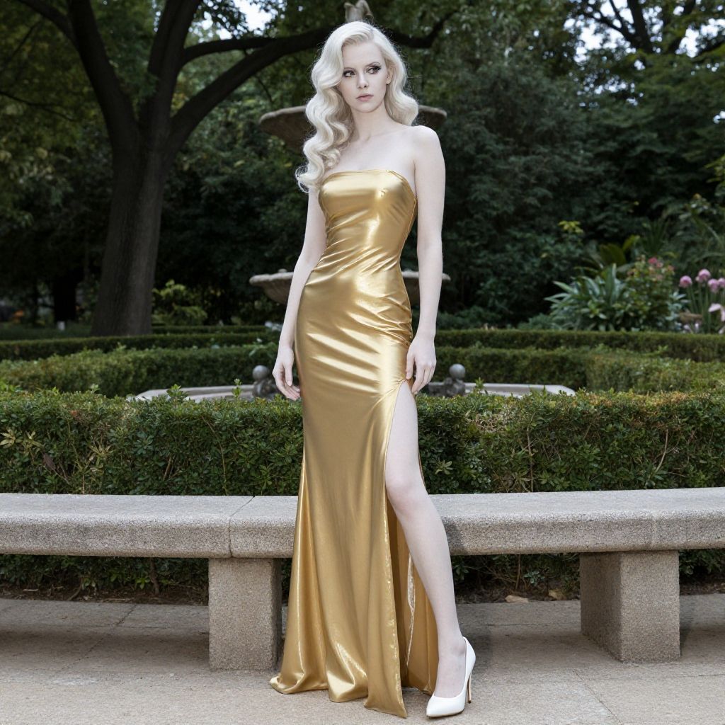 Gorgeous woman porcelain skin, luscious waves, delicate eyeliner, standing, wearing gold long latex dress, white stiletto shoes, thinking, cold stare, wavy hair, garden park, extravagant posing, realistic photo