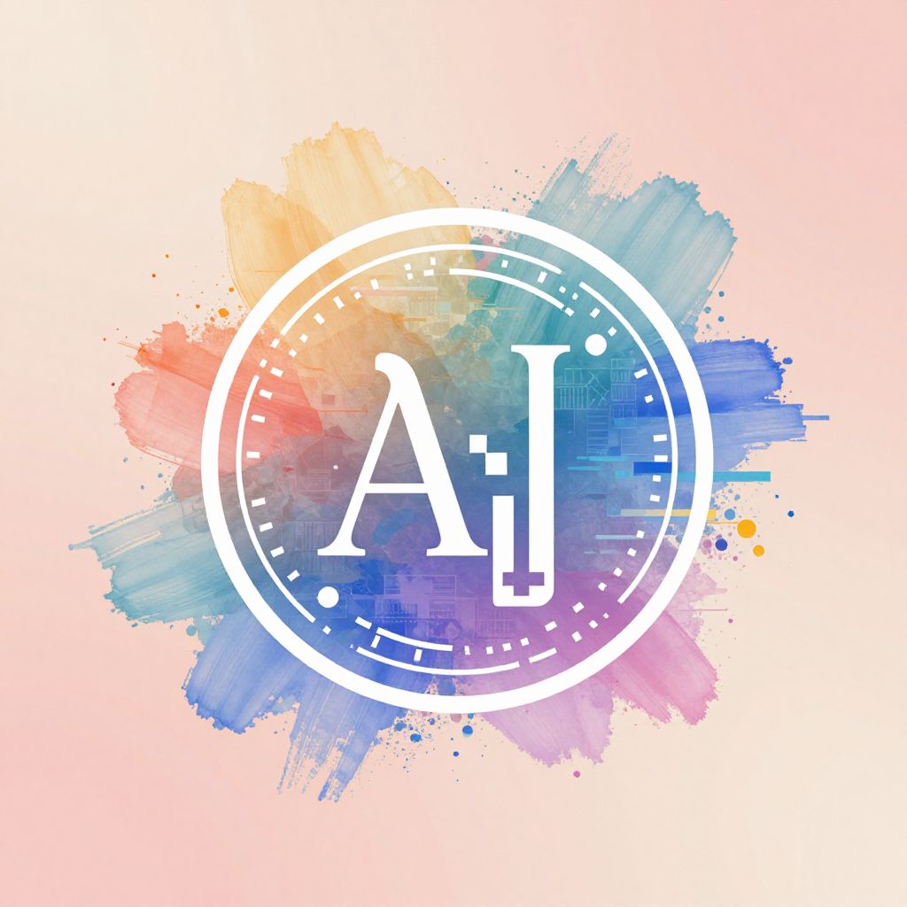 Digital artwork of a white circular logo with "AI" in bold letters, set against a colorful watercolor splash background in pink, blue, and orange