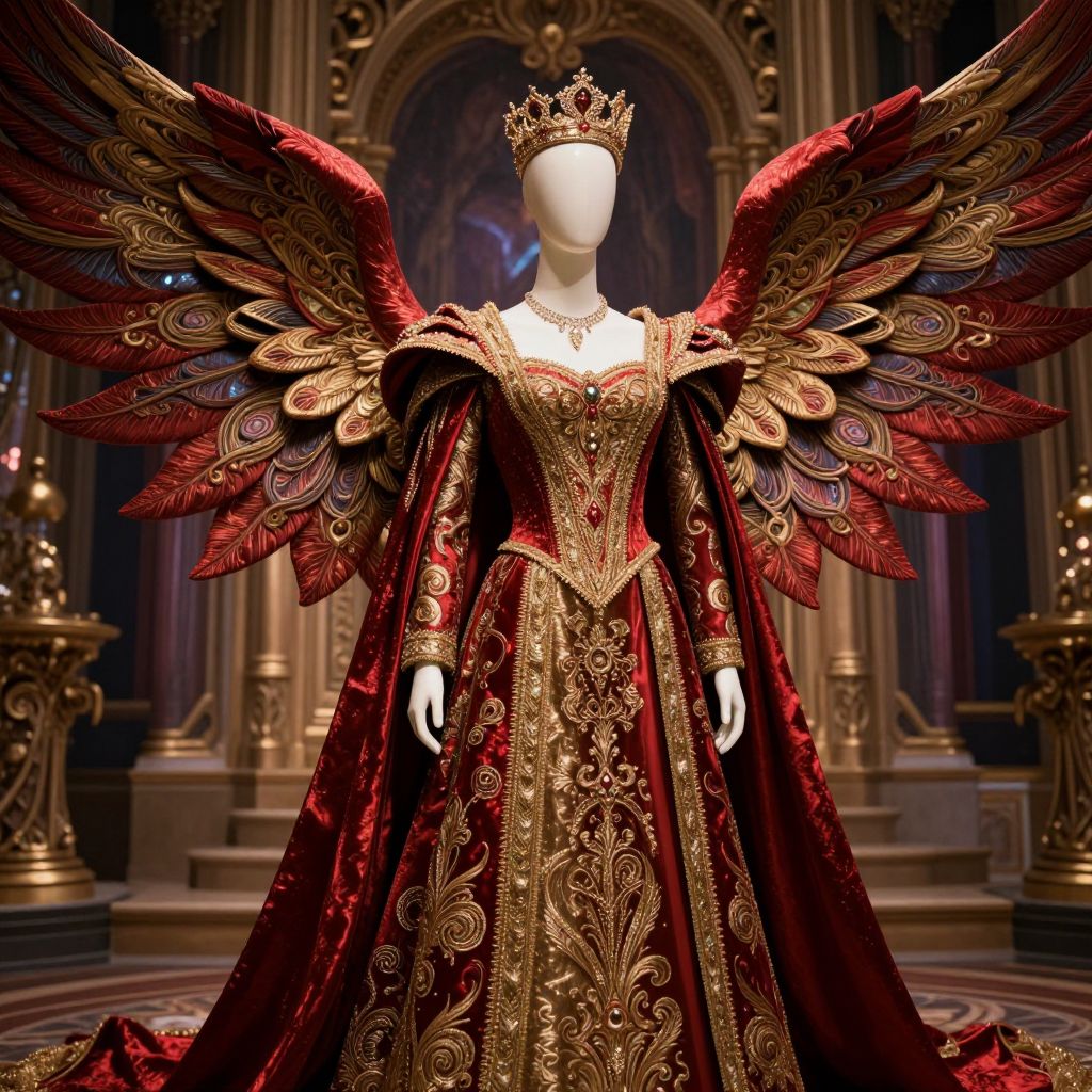 A mannequin wearing a red and gold costume with wings and a crown on his head, detailed and intricate design, luxurious fabrics, elegant and fantastical atmosphere, high-quality image, intricate detailing, fantasy theme, vibrant colors, dramatic lighting, intricate patterns, magical and enchanting environment, exquisite craftsmanship, grand and majestic setting, dramatic shadows, intricate wing design, opulent and regal appearance, exquisite attention to detail, fantasy art style, magical and whimsical elements, luxurious and extravagant appearance, dramatic and enchanting visual effects, intricate and elaborate costume, grand and elaborate setting, magical and mystical atmosphere, exquisite and detailed craftsmanship, fantastical and imaginative elements, dramatic and enchanting lighting, intricate and elaborate wing design, opulent and regal appearance, luxurious and extravagant costume, magical and enchanting environment, exquisite and detailed artistry, fantastical and imaginative atmosphere, dramatic and enchanting visual presentation, intricate and elaborate costume design, grand and majestic setting, magical and mystical elements, exquisite and detailed craftsmanship, fantastical and imaginative elements, dramatic and enchanting lighting, intricate and elaborate wing design, opulent and regal appearance, luxurious and extravagant costume, magical and enchanting environment, exquisite and detailed artistry, fantastical and imaginative atmosphere, dramatic and enchanting visual presentation.
