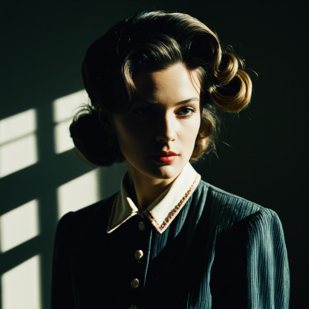 Van Dyke hairstyle on woman, wearing vintage outfit, in art hall, captured in fashion editorial style with harsh shadows.
