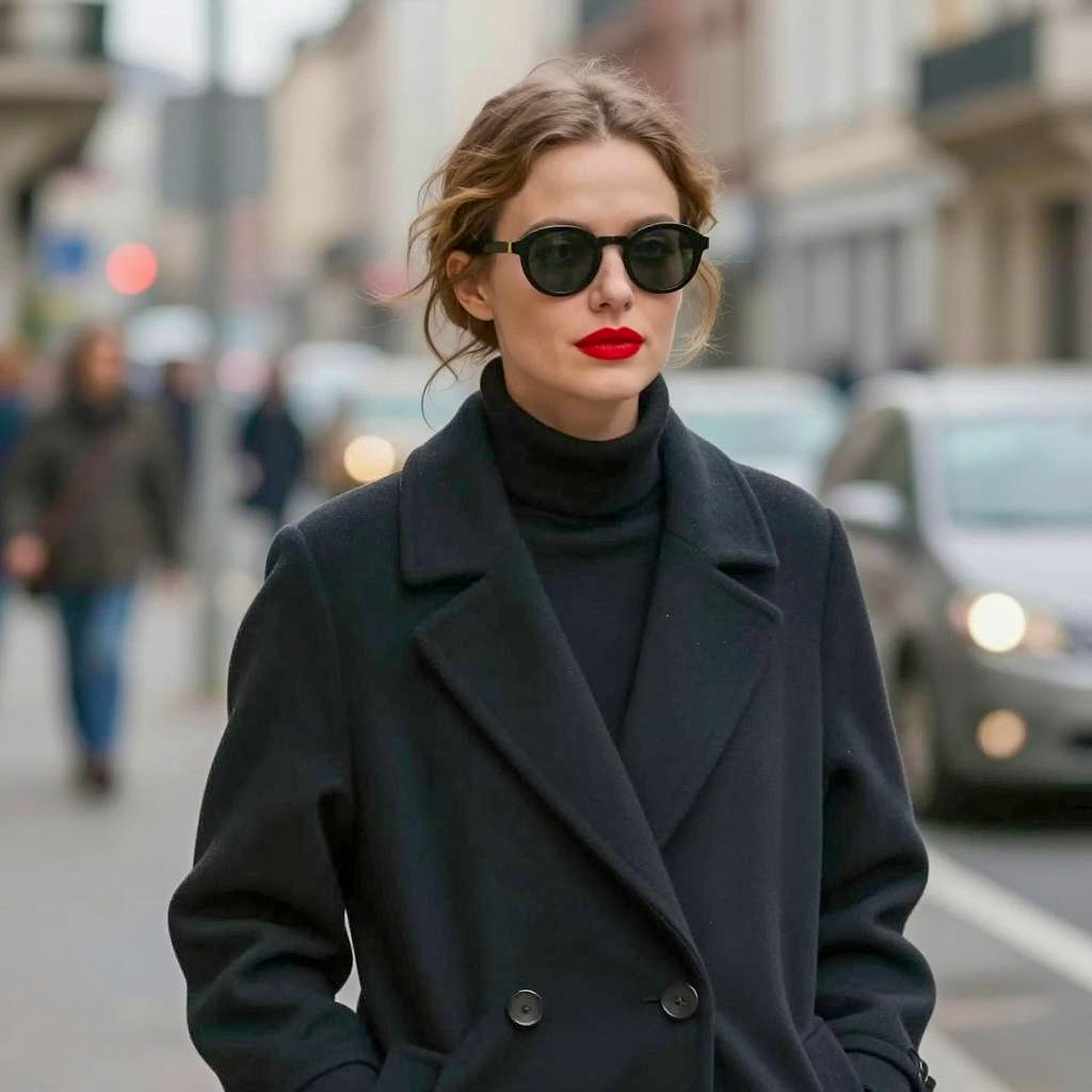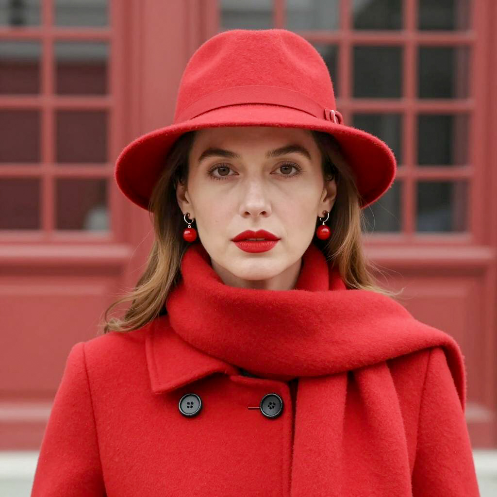 Woman in a red coat and hat, black sunglasses, red earrings, red lipstick, sitting at a café table. Red umbrella overhead. Background: blurred people, red awnings, street. Hands resting on table, holding glassware. Neutral expression. Photograph.