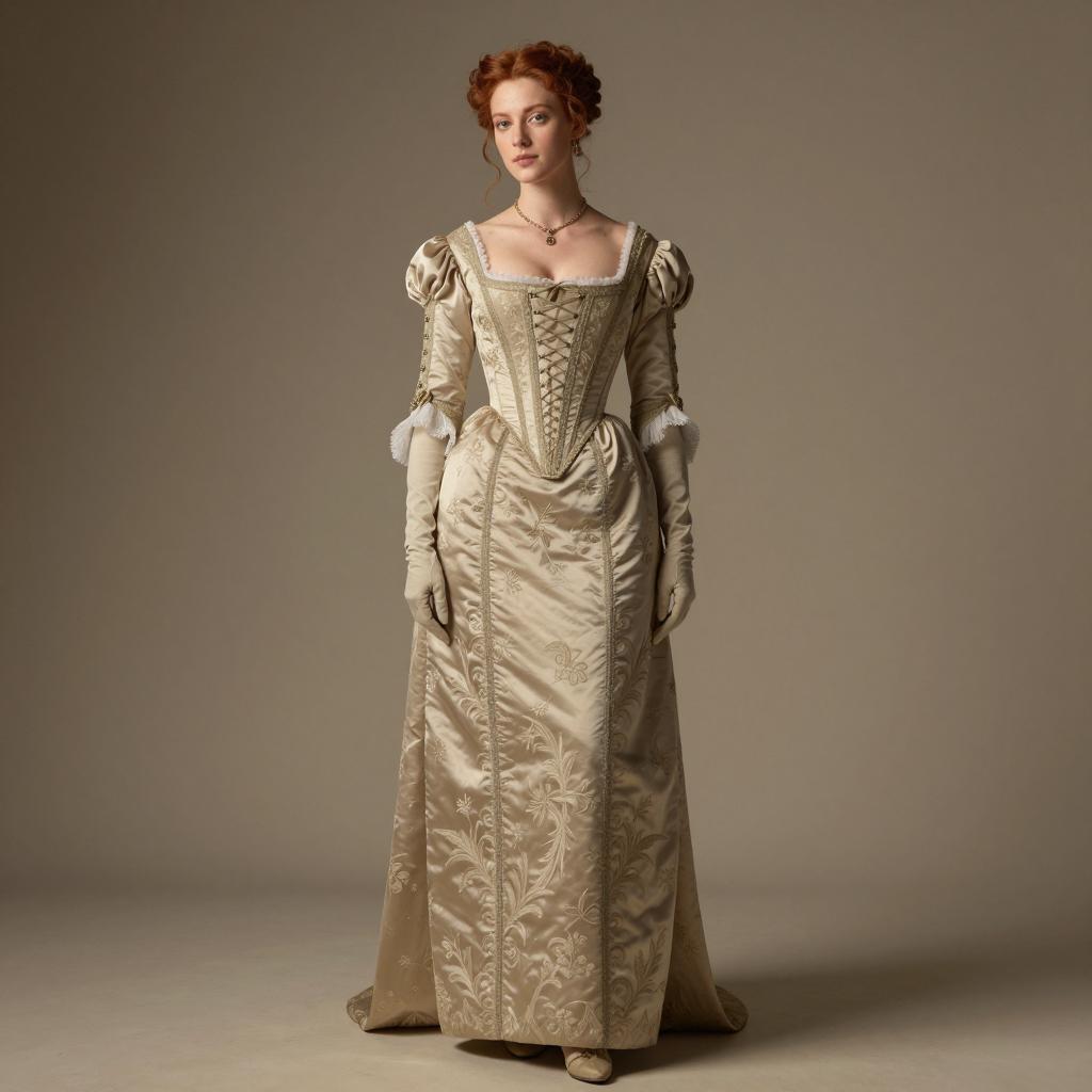 Late victorian evening dress, photorealistic portrait of a young woman, Renaissance-style, full-body, standing, wearing a pale beige, intricately embroidered, fitted Renaissance gown with puffed sleeves, long gloves, and a low-cut neckline, red hair in an updo, fair skin, neutral expression, soft golden light, cloudy background, subtle bokeh, elegant, sophisticated, historical fashion, delicate jewelry, soft shadows, realistic ures, slightly dramatic lighting, portrait photography style, detailed clothing, feminine, classic, 16th-century attire