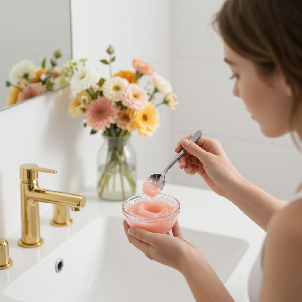 Woman applying skincare product while holding a bowl of pink scrub in a bright, modern bathroom featuring a sink, gold faucet, and a vase of colorful flowers.