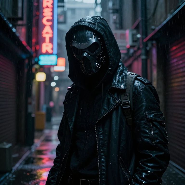 Cyberpunk photograph: Dark, rain-soaked alley with neon "EAT" sign. Anonymous figure in black hooded mask, reflective visor