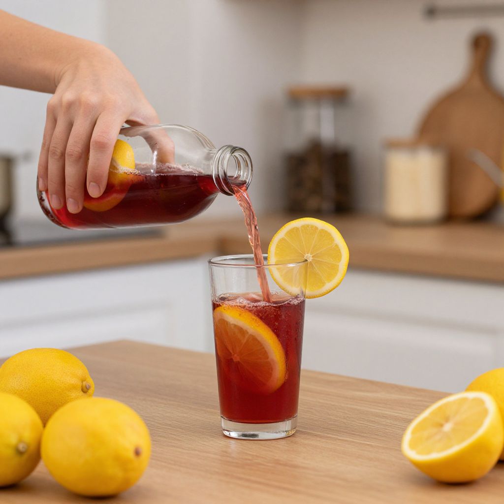 Woman pouring vibrant red non-alcoholic natural calm sangria from a glass bottle into a clear glass garnished with lemon slices, set against a cozy kitchen backdrop featuring wooden countertops and fresh lemons.