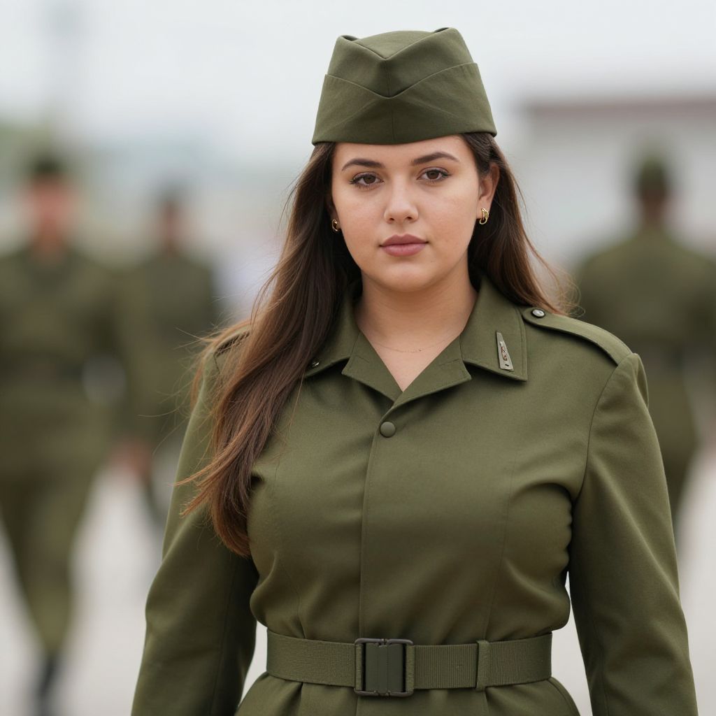 Photograph of a confident woman with long brown hair, olive-green military uniform, and matching hat, standing in a blurred outdoor background with other soldiers.