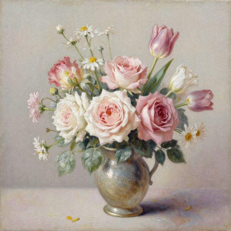 Lilac oil painting portraying a vintage still life with a bouquet of lilacs in a rustic vase, rich color palette, detailed petals, thick impasto technique, warm ambient light