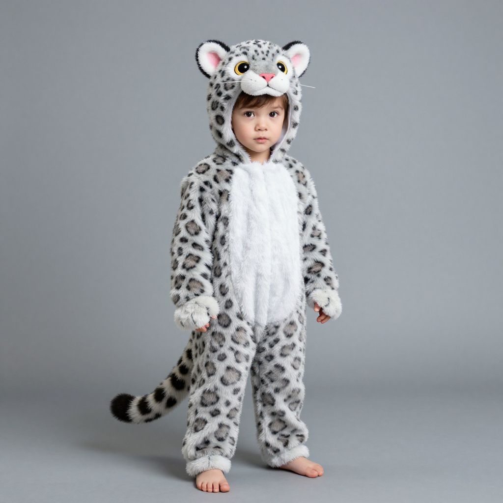 Snow leopard toddler costume, solo, 1boy, male focus, animal costume, full body, grey background, barefoot, looking at viewer, standing, tail, simple background, kigurumi