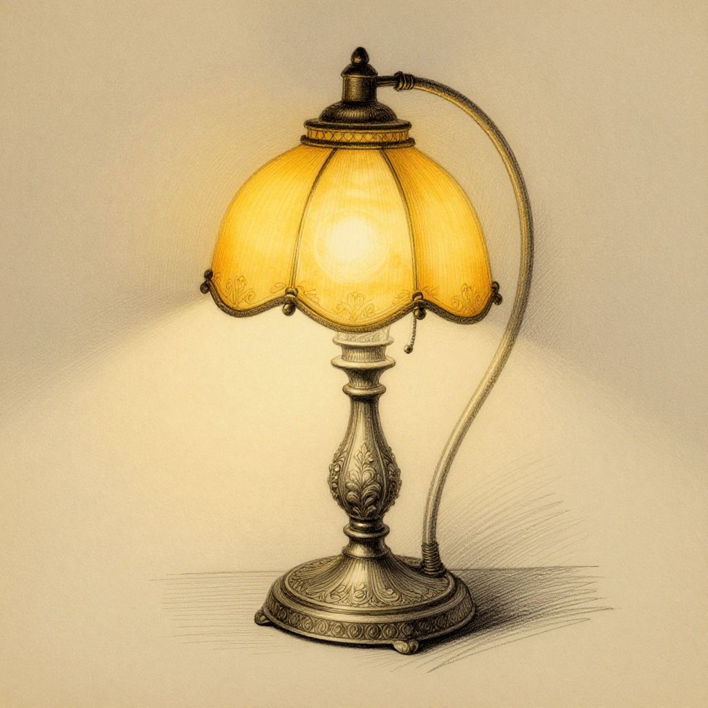 Desk lamp drawing in classic Victorian style, ornate base and decorative floral patterns, softly illuminated with yellow-toned light, elegant pencil and charcoal sketch on textured paper, vintage ambiance with a nostalgic feel