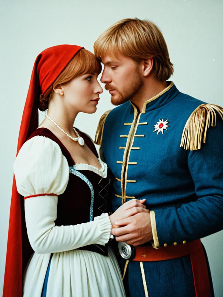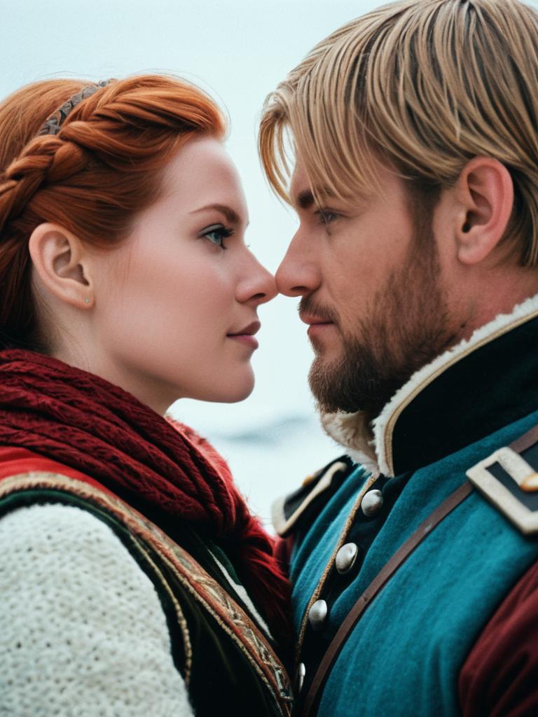 Couple in Anna and Kristoff Costume, close-up romantic headshot, photorealistic realism