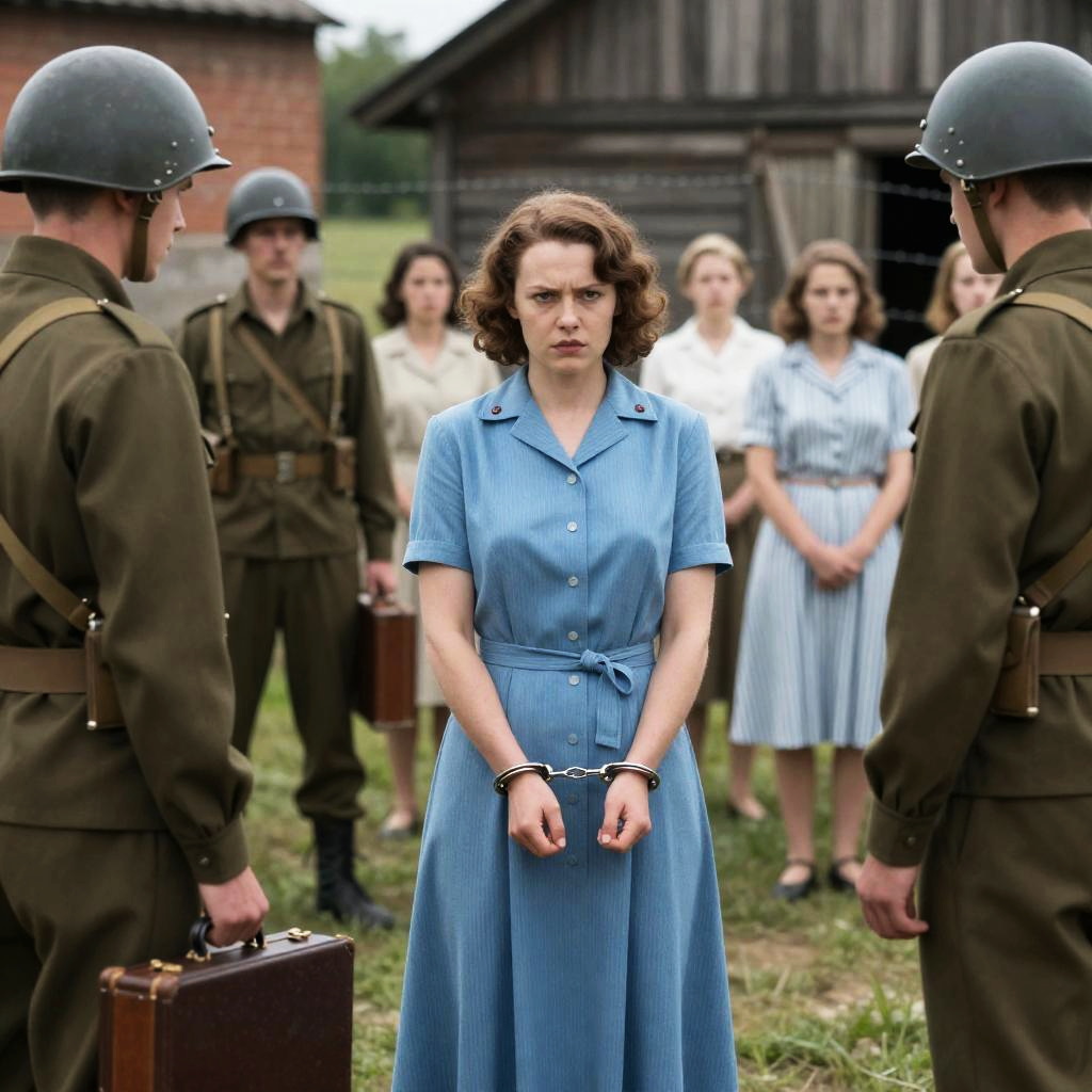 Photograph of a WWII-era scene. Central focus: woman in blue dress, hands cuffed, flanked by two soldiers. Background: group of women in striped dresses, wooden building, barbed wire. Soldiers in green uniforms, helmets, one holding briefcase. Grass ground, brick building left, wooden building right. Intense expressions on woman's face, neutral on soldiers. Multiple soldiers and women, three soldiers in foreground, six women in background.