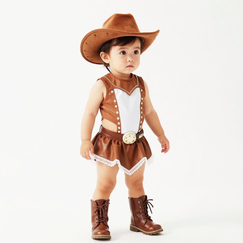 Young toddler wearing a brown cowboy hat, brown leather vest with star embellishments, matching brown skirt with white lace trim, brown boots, and a belt with a large buckle. The child stands against a white background in a cowboy-themed cheerleader costume.