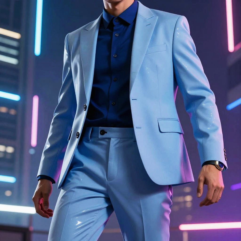 Light blue suit with dark blue shirt, futuristic cyberpunk cityscape background, neon lights reflecting off the fabric, dynamic posture, sleek modern design with metallic accents, vibrant and surreal color palette, dramatic shadows and highlights