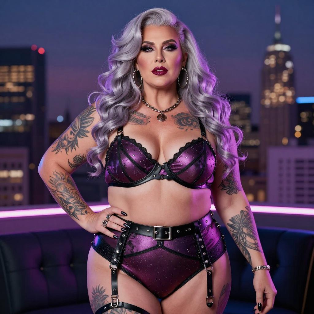 Photo-shoot, confident pregnant woman in her early 30s, maternity model, long honey-blonde loose waves with delicate floral hairpiece, pregnant rounded third-trimester silhouette, Lingerie Plunge Set, elegant romantic maternity boudoir editorial, soft ivory studio backdrop with natural window light and sheer drapery studio background