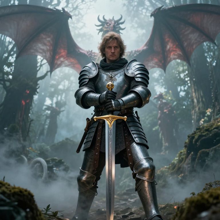 Digital artwork of a blond, serious-looking knight in shiny silver armor with intricate designs, holding a glowing sword in a misty, enchanted forest.