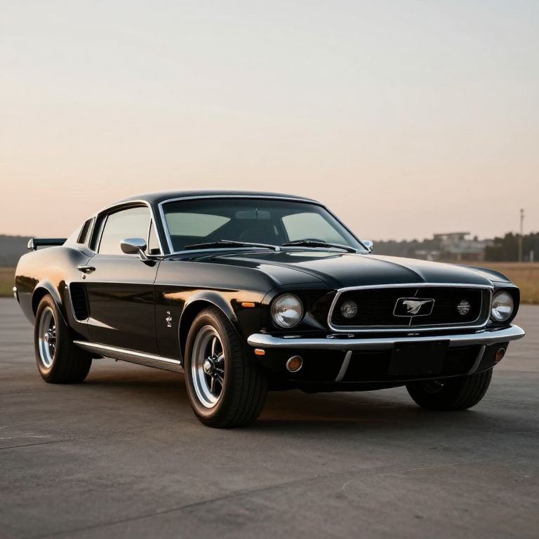 A sleek black classic muscle car, reminiscent of a Ford Mustang, is captured in high-definition detail against a soft, vintage-inspired backdrop, showcasing its iconic design and dramatic lighting effects.