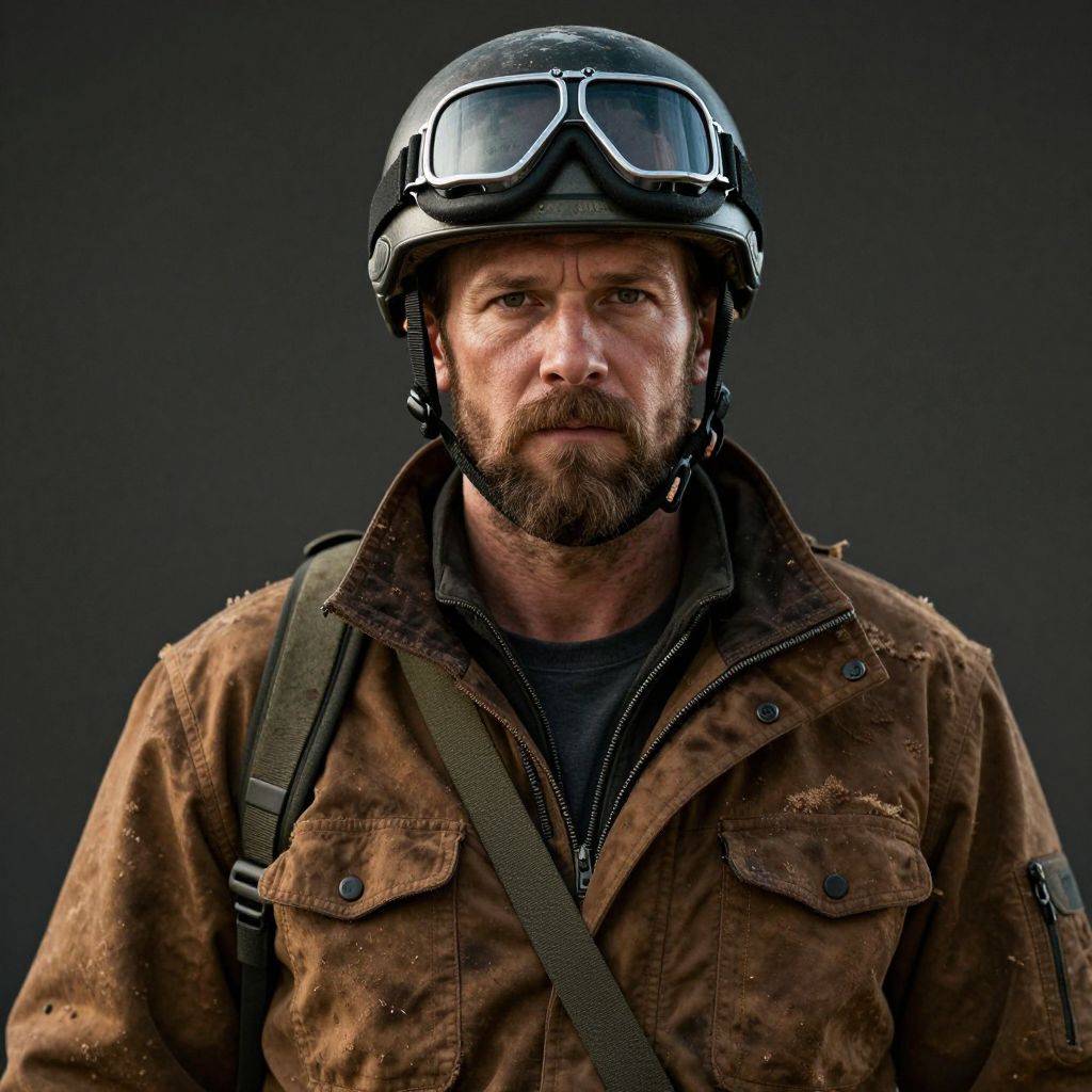 A rugged man with a beard, wearing a helmet with a pair of goggles resting on top, and a distressed brown jacket with a visible strap across the front, cinematic lighting, highly detailed, photorealistic, 8k.