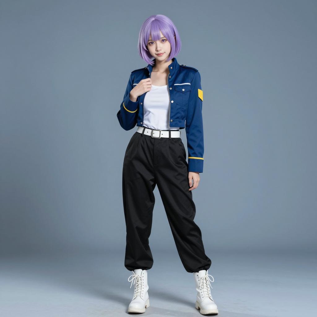 A cosplayer with a light purple bob haircut and pale skin poses against a blue gradient background. She is wearing a dark blue military-style cropped jacket with yellow patches on the sleeves, a white tank top underneath, black baggy pants, a white belt, and white lace-up boots. The subject stands with her right hand lightly touching the jacket collar and her left hand relaxed by her side, looking directly at the camera with a slight smile. The image features soft lighting and a shadow on the floor.