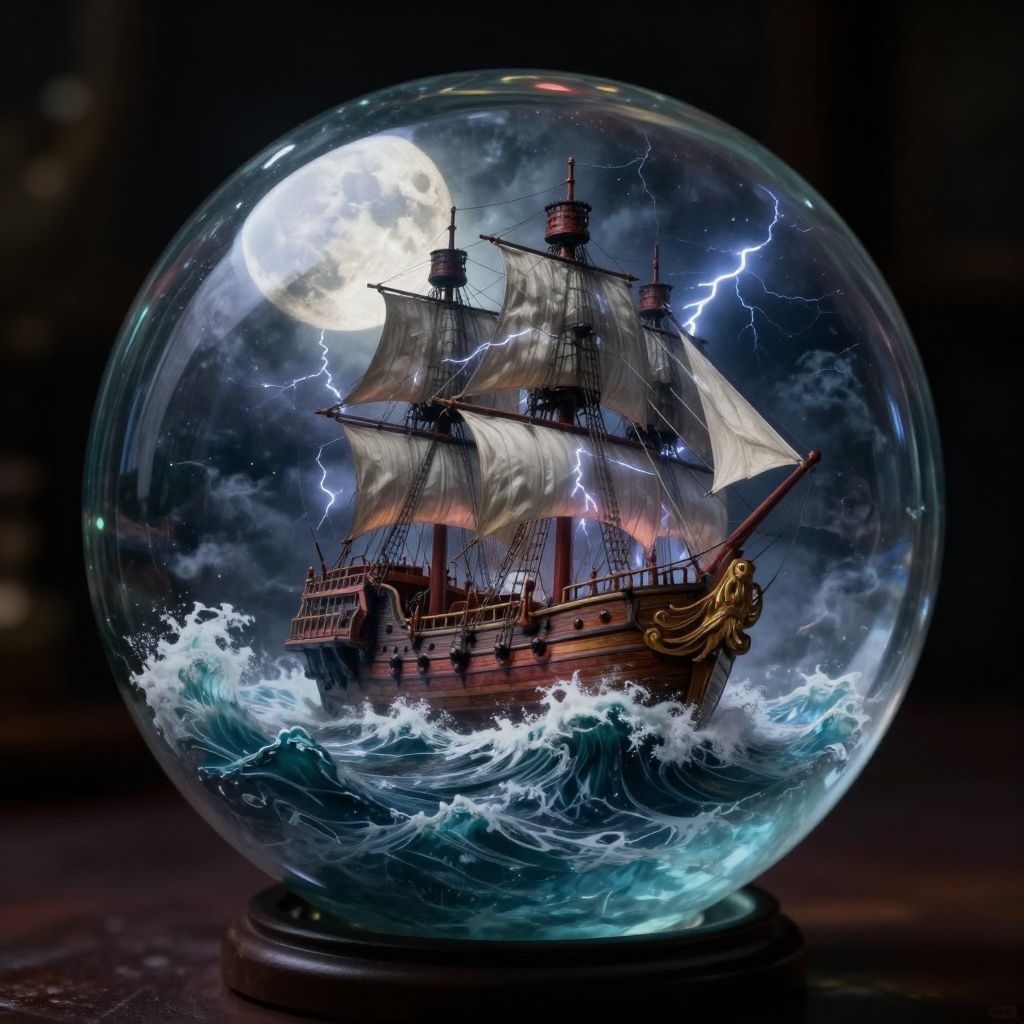 A glass sphere sculpture, concealed inside the sphere is a large Pirate Ship in a Lightning storm, large waves, in the dark, detailed image, 8k high quality detailed, the moon, shaped sphere, amazing wallpaper, digital painting highly detailed, 8k UHD detailed oil painting, beautiful art UHD, focus on full glass sphere, bokeh, background Modifiers: extremely detailed Award winning photography, fantasy studio lighting, photorealistic very attractive beautiful imperial colours ultra detailed 3D, (Very Intricate)
