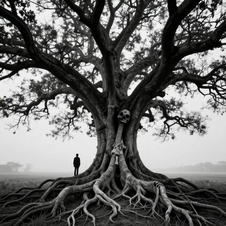 A solitary figure stands beneath a colossal, skeletal tree whose sprawling branches reach into the void, its exposed roots extending outward like veins of darkness, defying gravity and reality in a hauntingly surreal landscape.