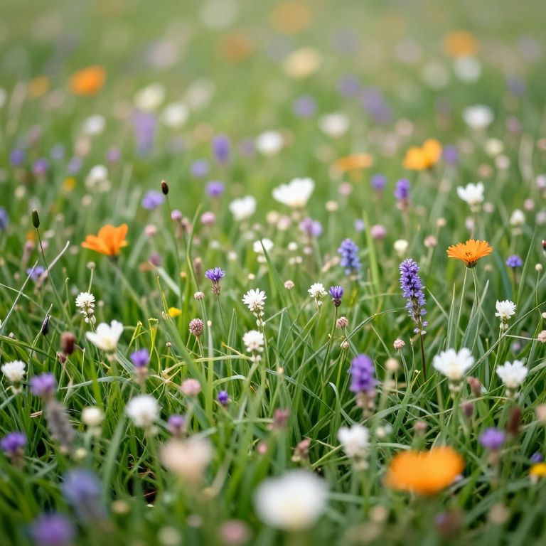 Photograph of a vibrant meadow filled with white, orange, purple, and blue wildflowers amidst lush green grass, with a soft-focus background enhancing