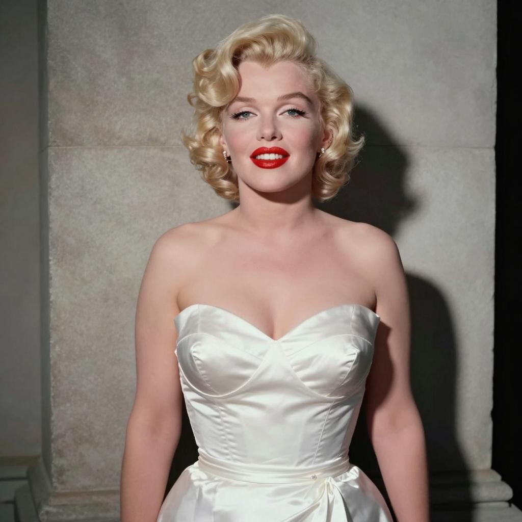 Marilyn monroe cosplay, photograph of a blonde woman with short wavy hair, wearing a white satin strapless wedding dress with a deep V-neck, standing against a gray stone wall, fair skin, red lipstick, elegant and classic style, realistic, slightly overexposed, movie still, vintage Hollywood glamour, soft lighting, slight smile, looking directly at camera, high-quality, detailed ure of dress and hair, slight shadow on wall, realistic colors and ures
