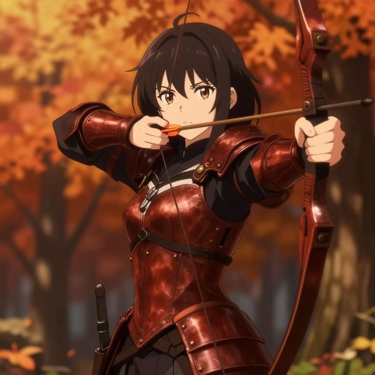 Anime leather armor female archer, mid-action pose with bow drawn, layered armor pieces, subtle leather texture, soft glow, detailed facial expression, rich autumn colors