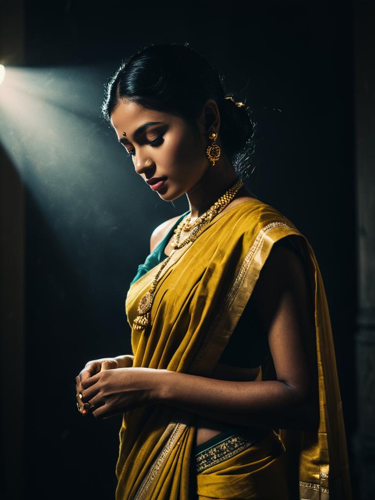 Woman in Malmal Cotton Saree, waist-up editorial portrait, photorealistic tones --sref 1391
