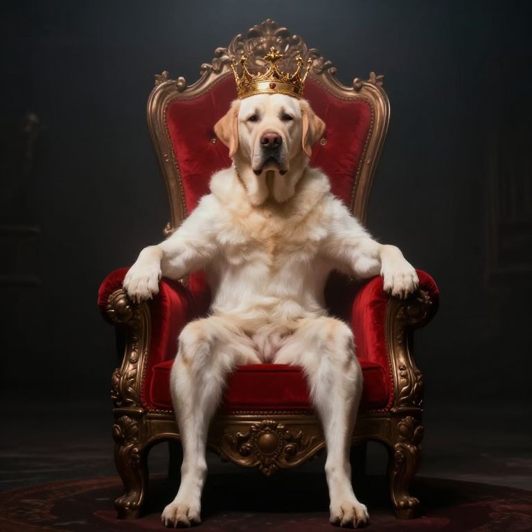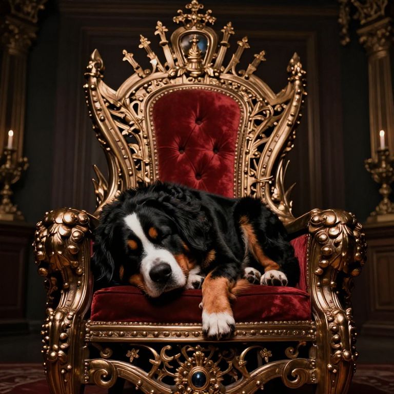 Hacktivism wide angle, bernese mountain dog sleeping on a kings throne, hyper realism, photo realistic, 8k, reflections,
