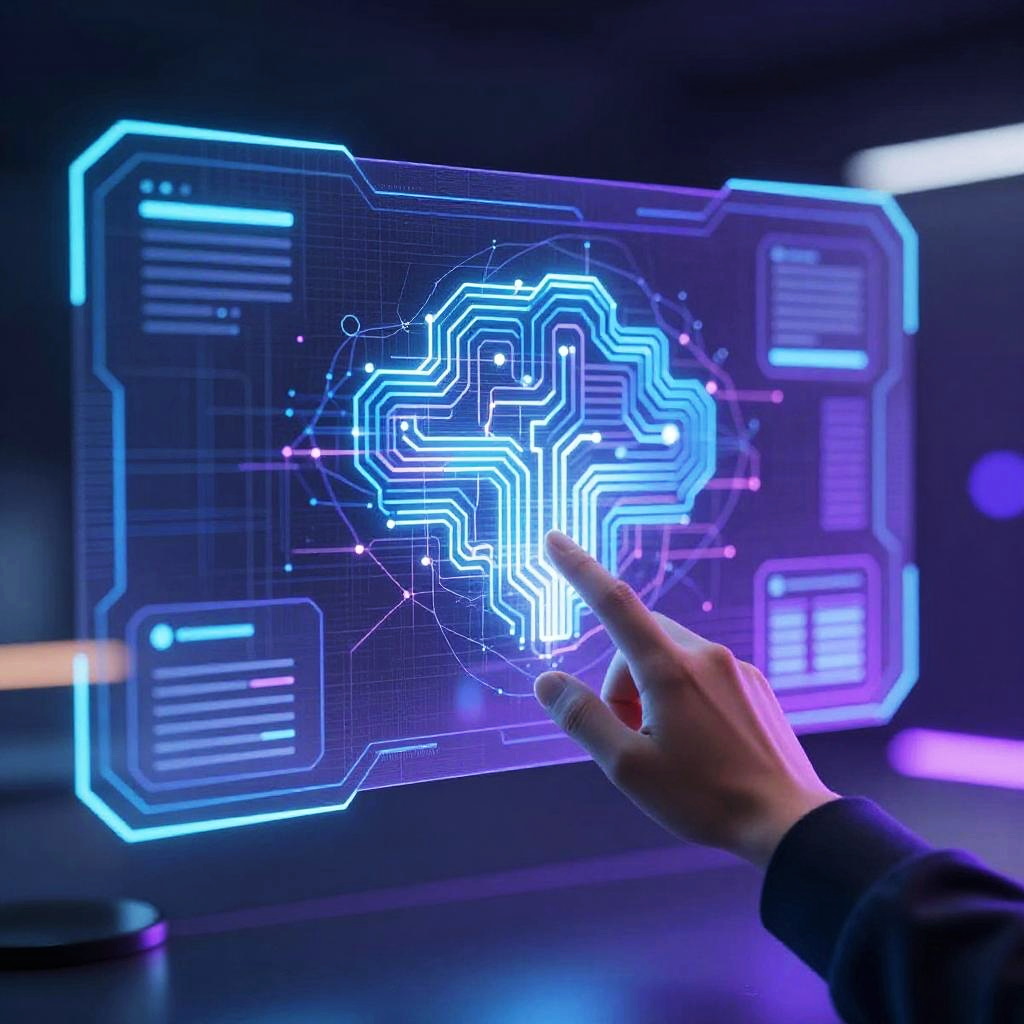 Ai picture upload theme showing a transparent display panel with images being scanned and converted by AI brain, neon circuits and artificial intelligence symbols, sci-fi atmosphere, dark background with glowing blue and purple hues, ultra high detail