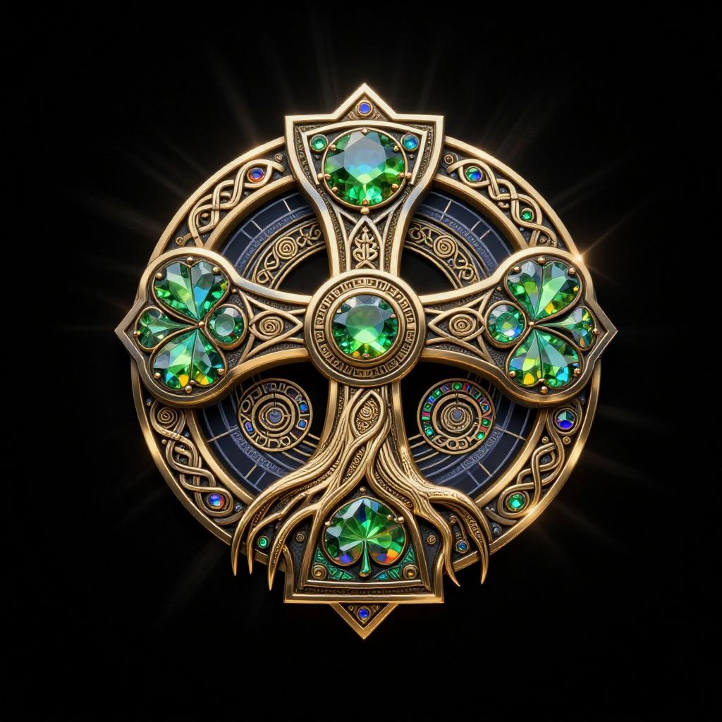 Professional logo photograph, Innovative logo Design, (colorful logo, gemstone design style, Antique design style:1.2), (Celtic cross, Celtic stone, Celtic knots, Celtic spiral patterns, Shamrock), [twisting ancient life big tree roots:0.9], Fine engraving, ancient tattoo, amulet, charm, Love and Peace, life, supernatural, Irish, heliocentrism, Druidism, Ancient megalithic civilizations, minimalism, modern, elegance, avant-garde, fashionable, futuristic, majestic, aesthetic, abstract, vibrant colors and jewels in green, gold, Antique Gold, SchalenBlende, halcyon, rainbow, ornaments, (metallic:1.5), [(details:1.2): [ (many small details:1.3) : [ (many ultrasmall details: 1.2):(very detailed ultrasmall edges and microrelief:1.5):0.7 ]: 0.4 ] :0.2], shiny, sparkling, realistic lighting, Enhanced Lighting Effects, transparent, rays, god rays, soft shadows, LUT, cinematic, simple background, black background, amazing quality, best quality, high quality, 4K, 8K, 16K, UHD, absurdres, highres, incredibly detailed, (photorealistic), hyperrealistic, ultrarealistic, logoredmaf, ral-cltc, escher