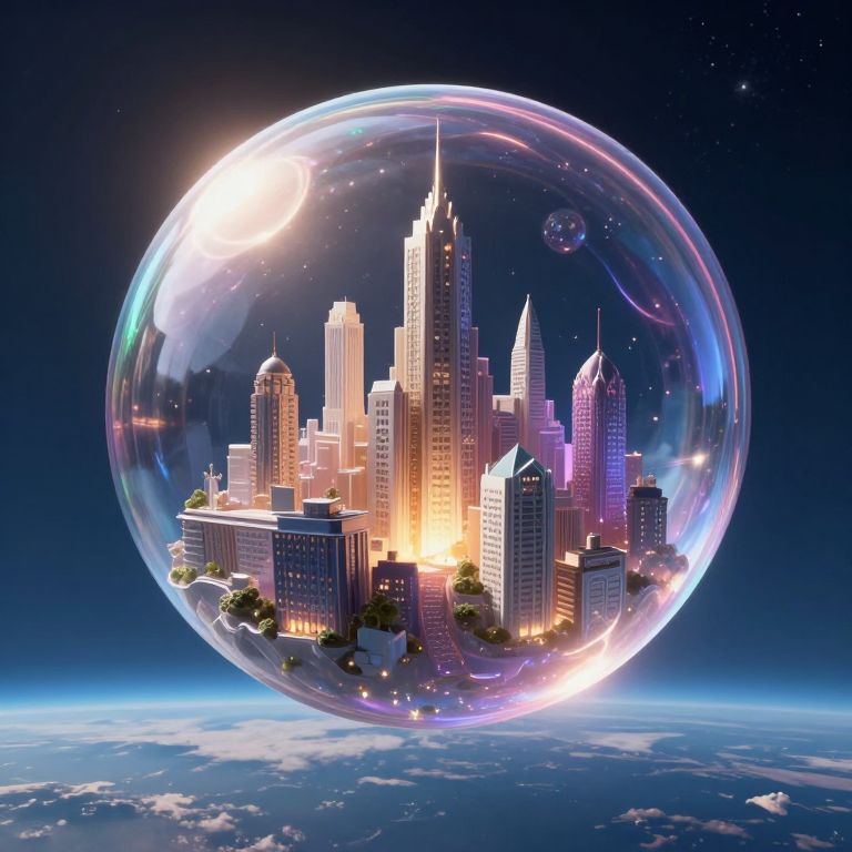 Digital illustration of a neon-lit futuristic cityscape inside a glowing, bubble-filled glass sphere, with vibrant blue and pink lights.