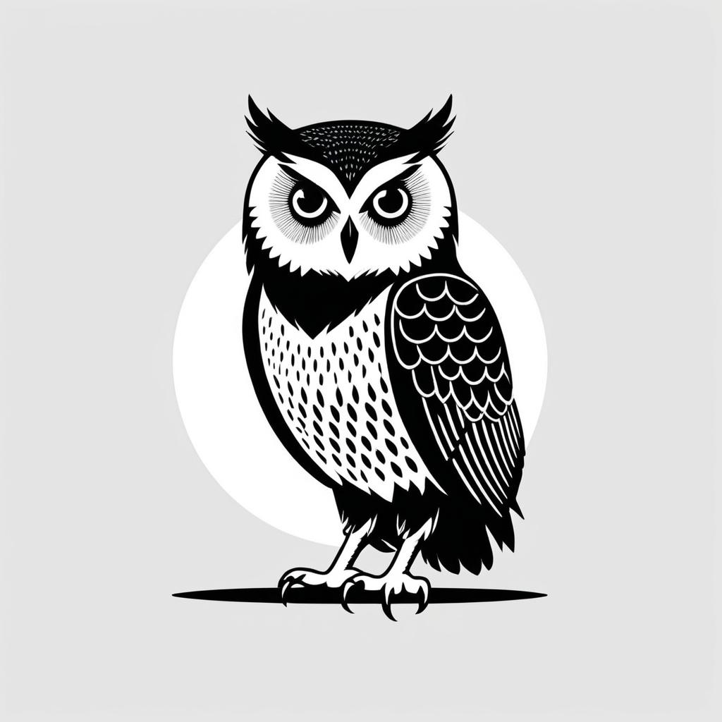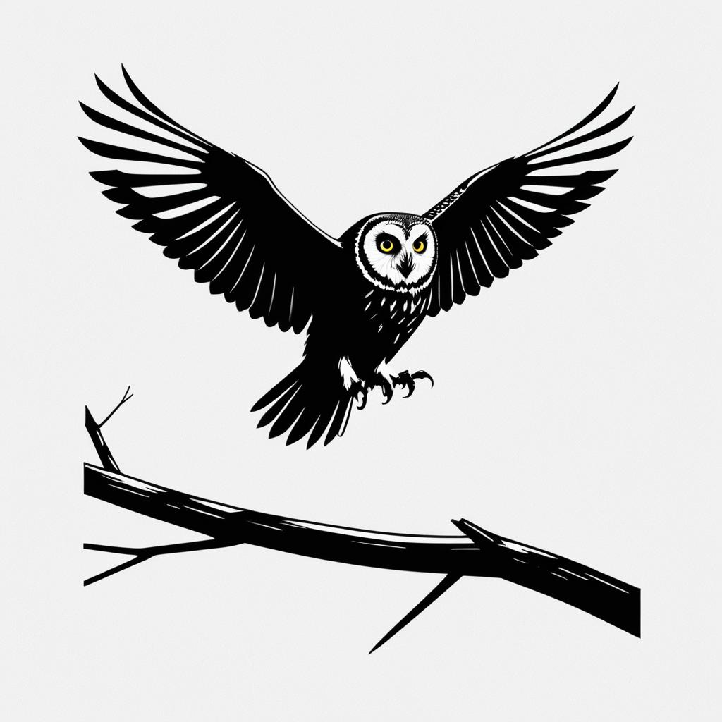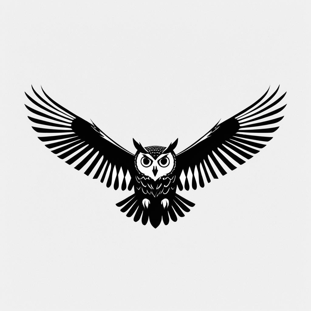 Black and white, minimalist logo-style design of a owl with outstretched wings and geometric feathers, standing on hind legs in a flat, geometric style suitable for two-color printing, clean and modern aesthetic